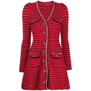 Red Color Knitted Women Mini Dress V Neck Long Sleeve